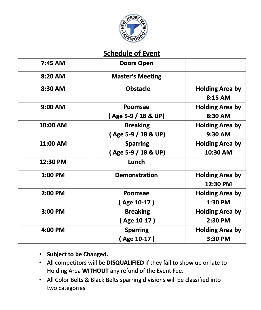- All Color Belts & Black Belts sparring divisions will be classified into two categories: World Class Sparring and Regular Sparring. Each master is strictly required to register students separately according to their skill level and division. Failure to do so may result in disqualification of the student(s) from the competition.